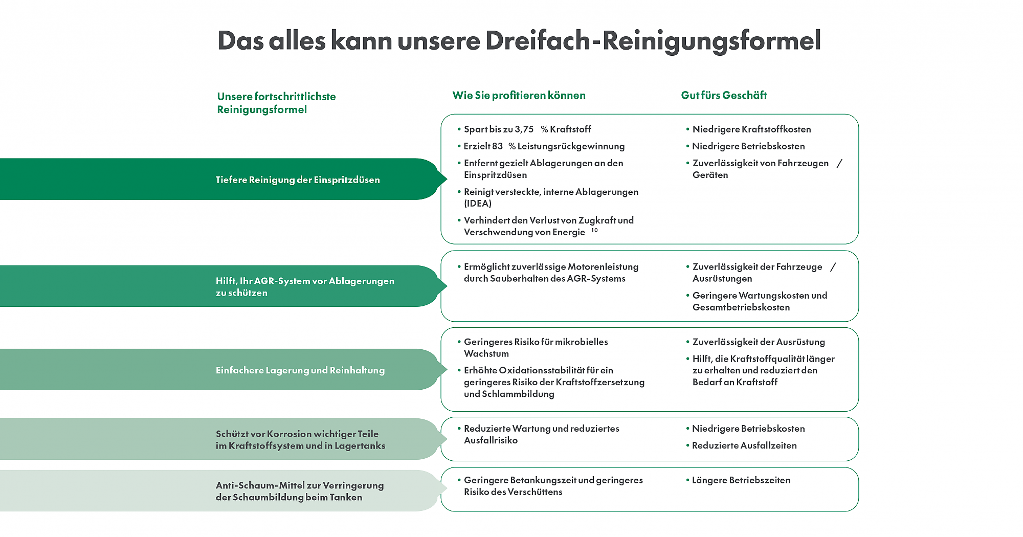 tiefgreifende Reinigung für zuverlässige Motoren, und eine Oxidationsstabilität, die das Risiko von Kraftstoffproblemen minimiert und weniger Wartungsaufwand durch effektiven Korrosionsschutz erfordert. Unsere Formel stellt 83 % der verlorenen Leistung wieder her, bietet verbesserten Schaumschutz und ermöglicht eine schnelle, volle Tankfüllung.