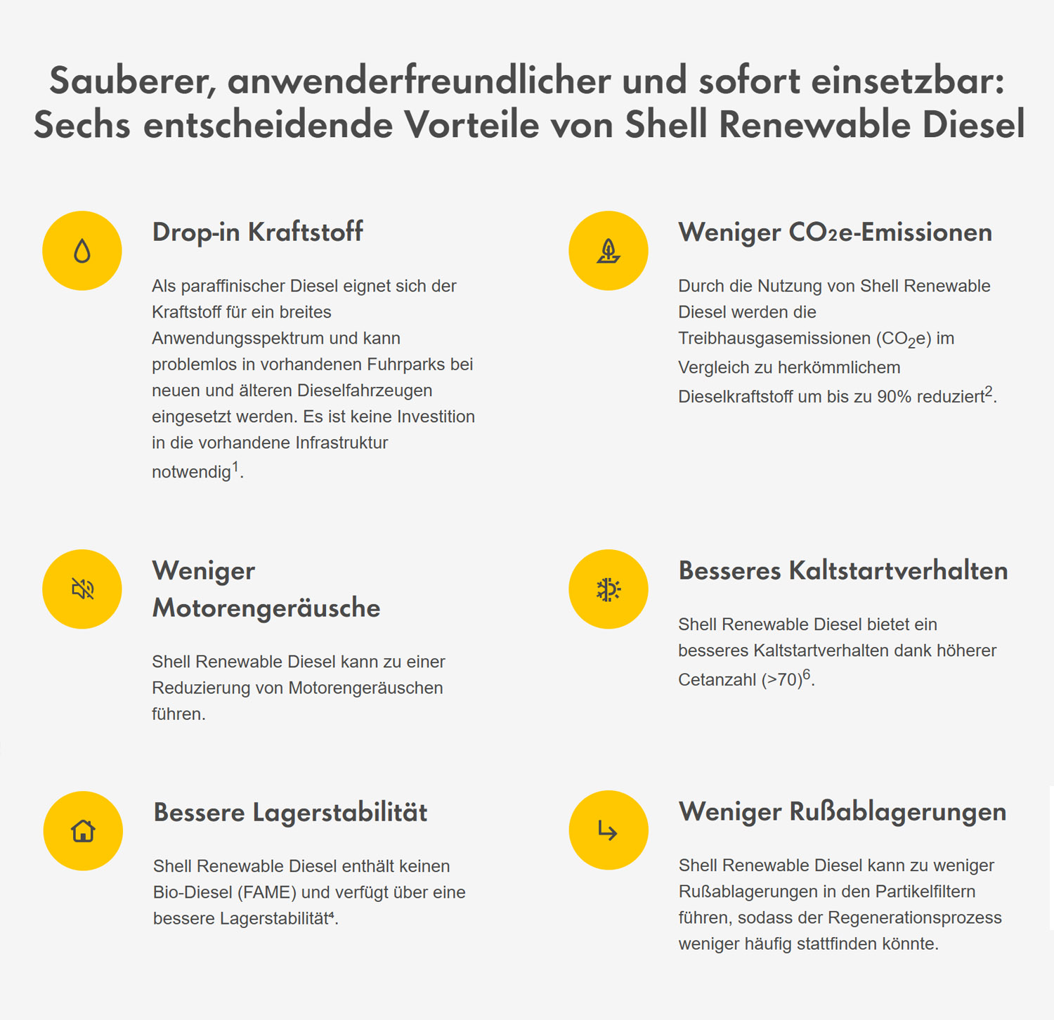 Shell Renewable Diesel besteht zu 100% aus Paraffinen und ist praktisch schwefel- und aromatenfrei sowie nahezu geruchslos. Zudem ist er leicht biologisch abbaubar und hat eine niedrigere Wassergefährdungsklasse (WGK1) als herkömmlicher Diesel. Dank einer höheren Cetanzahl verbrennt Shell Renewable Diesel sauberer und weist ein besseres Kaltstartverhalten auf.