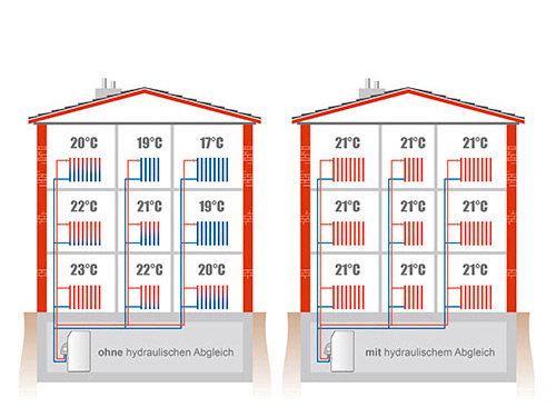 Die beste Pumpe und die effizientesten Thermostate nützen nichts, wenn nicht sämtliche Einzelkomponenten des Systems aufeinander abgestimmt sind. Dann kann es passieren, dass sich die Wärme ungleichmäßig im Haus verteilt. Näher am Heizkessel gelegene Heizkörper werden besser durchströmt und geben häufig unbemerkt mehr Wärme ab als eigentlich erforderlich. In weiter entfernten Räumen hingegen kommt gegebenenfalls zu wenig Wärme an.