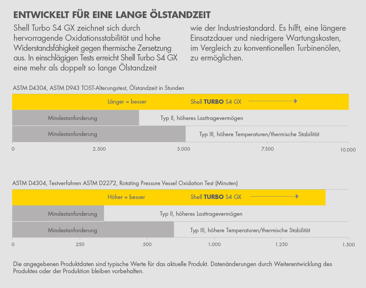 Die Shell Turbo S4 X-Serie ist ideal für industrielle Anwendungen, bei denen hohe Temperaturen und lange Betriebszeiten gefordert sind. Diese Hochleistungs-Turbinenöle zeichnen sich durch eine exzellente Alterungsbeständigkeit aus und gewährleisten somit eine außergewöhnliche Schmierleistung über lange Zeiträume hinweg.