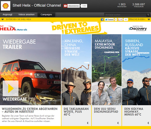 ("Extrem abgefahren - Autos im Härtetest") testen drei Prominententeams den Schmierstoff auf einer Tour durch besonders kalte, heiße und raue Gebiete der Erde. Spannende Hintergrundinformationen, Interviews und Zusatzmaterialien sind ab sofort auf dem Shell eigenen YouTube Kanal unter www.youtube.com/shellhelix zugänglich.