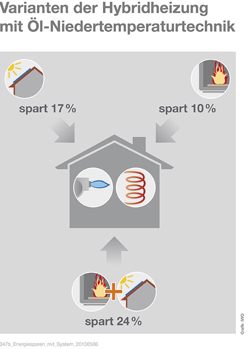 Eine inzwischen weit verbreitete Hybridlösung ist die Kombination aus Ölheizung und Solarthermie. In den Sommer- und Übergangsmonaten übernimmt die Solaranlage den Löwenanteil der Wärmeversorgung, so dass sich die Ölheizung erst dazu schaltet, wenn der Bedarf durch die Sonnenenergie allein nicht mehr gedeckt werden kann. Zur Unterstützung der Solaranlage wird inzwischen auch vermehrt ein wasserführender Holzkaminofen integriert, der seine Wärme ebenfalls in das Heizsystem einspeist. Dadurch muss die Ölheizung noch seltener aktiv werden.