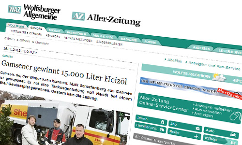 "Gamsen. So, der Winter kann kommen: Maik Scharfenberg aus Gamsen ist gewappnet. Er hat eine Tankwagenladung voll Heizöl bei einem Shell-Gewinnspiel gewonnen. Gestern kam die Ladung."
