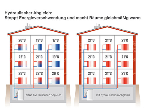 Daraufhin sollte die Heizungsanlage vor allem dann überprüft werden, wenn sich durch Sanierungsmaßnahmen wie Wärmedämmung oder neue Fenster der Wärmebedarf eines Hauses verändert. Die geeignete Maßnahme ist der hydraulische Abgleich. Dabei berechnet der Fachhandwerker mithilfe eines speziellen Computerprogramms an welchen Komponenten er bestimmte Einstellungen verändern muss, um eine optimale Wärmeverteilung zu erzielen. Unnötige Wärmeverluste gehören damit der Vergangenheit an. Darüber hinaus sinkt der Stromverbrauch der Umwälzpumpe und es gibt keine störenden Fließgeräusche mehr in den Heizkörpern.