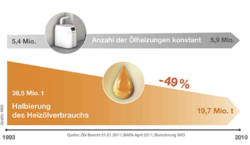 Obwohl die Anzahl der bundesweit installierten Ölheizungen laut Statistik des Schornsteinfegerhandwerks mit rund sechs Millionen Anlagen seit 1993 nahezu unverändert blieb, ging der Heizölverbrauch im selben Zeitraum um fast die Hälfte zurück. Einen maßgeblichen Anteil an dieser Entwicklung hat der Austausch alter Heizungen gegen effizientere Ölheiztechnik. Auch die Kombination von modernen Ölheizungen und Solarthermie trägt zum geringeren Heizölverbrauch bei. In den vergangenen Jahren wurde etwa jede zweite neue Öl-Brennwertheizung gemeinsam mit einer Solarwärmeanlage installiert. Einen so hohen Solaranteil erreicht kaum ein anderes Heizsystem.