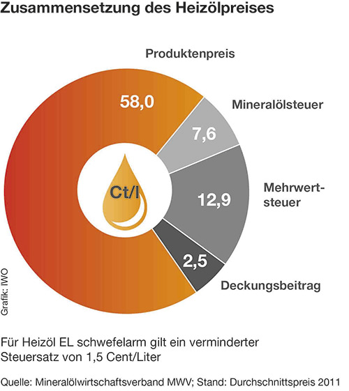 Die Zusammensetzung des Heizölpreises ist seit jeher transparent. Im vergangenen Jahr entfielen bei Standardheizöl durchschnittlich 58 Cent auf den reinen Produktenpreis. Die Mineralölsteuer schlug mit 7,6 Cent und die Mehrwertsteuer mit 12,9 Cent zu Buche. Insgesamt betrug der Steueranteil je Liter Heizöl also 20,5 Cent.