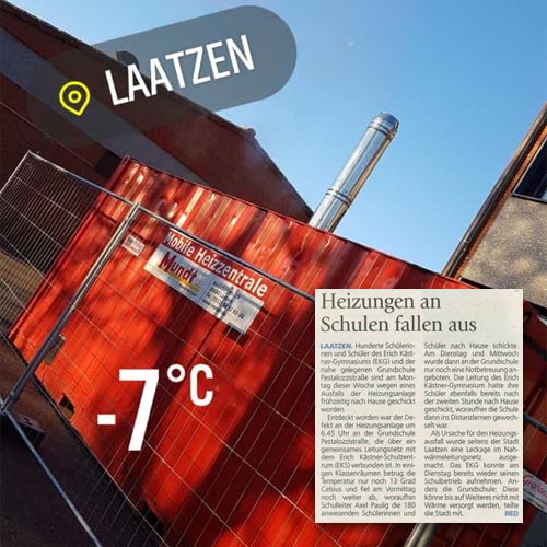 Der dringlichen Anfrage der Stadt Laatzen, kam unsere Haustechnik umgehend nach und so konnte kurzfristig ein Heizcontainer angeschlossen und wenig später durch die Kollegen der Mundt GmbH Hannover mit Heizöl versorgt werden. Bis heute wird die Alternativlösung ein bis zwei mal die Woche mit Heizöl beliefert.