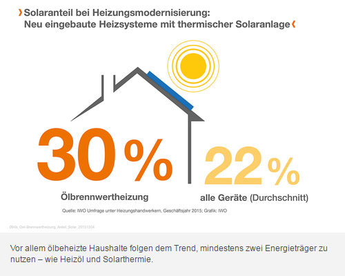 Hausbesitzer, die ihre Ölheizung modernisieren, bauen überdurchschnittlich oft im Zuge dessen auch eine Solarwärmeanlage ein. Im Jahr 2015 wurden 30 Prozent der mit Brennwerttechnik erneuerten Ölheizungen zusätzlich mit dieser erneuerbaren Energiequelle kombiniert. Das zeigt eine Befragung des Instituts für Wärme und Oeltechnik (IWO) unter Heizungsbaubetrieben.