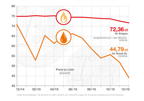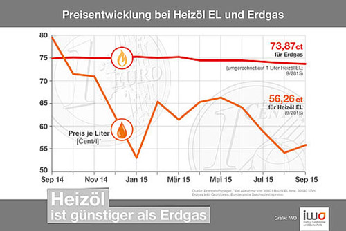 Wer sich jetzt einen Heizölvorrat für die anstehende Heizsaison zulegt, zahlt dafür, je nach Abnahmemenge, einige hundert Euro weniger als vor einem Jahr. Nach Erhebungen der Fachzeitschrift „Brennstoffspiegel“ lag der bundesweite Verbraucherpreis für 100 Liter bei einer Abnahmemenge von 3.000 Litern im September 2015 im Schnitt bei 56,26 Euro. Die Durchschnittspreise für Heizöl waren damit gut 20 Prozent günstiger als die entsprechende Energiemenge Erdgas.