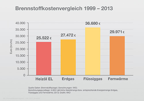 Nach einer IWO-Berechnung musste ein Ölheizer im 15 Jahres-Zeitraum von 1999 bis 2013 bei einer jährlichen Abnahmemenge von 3.000 Litern insgesamt 25.500 Euro für Heizöl ausgeben. Für die entsprechende Energiemenge Erdgas fielen im gleichen Zeitraum 27.500 Euro an. Haushalte, die mit Fernwärme oder Flüssiggas beheizt werden, mussten mit rund 30.000 Euro bzw. 37.000 Euro sogar noch tiefer in die Tasche greifen.