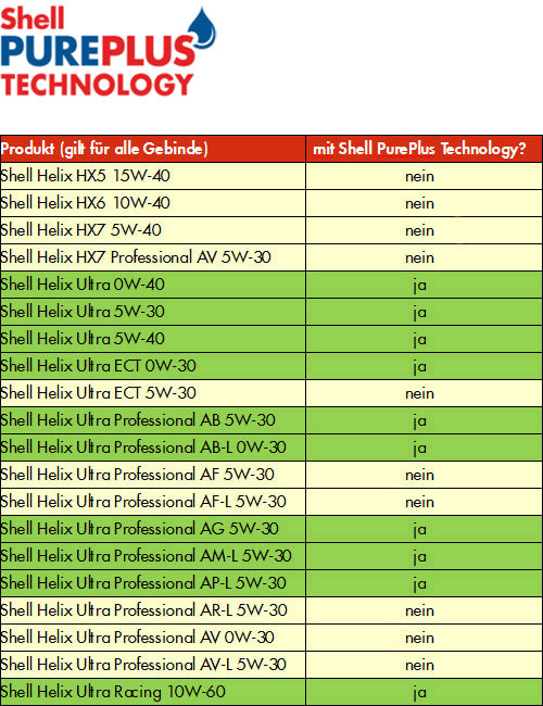 Mittelfristig soll die Shell PurePlus Technology in allen Shell Helix Ultra Produkten eingesetzt werden. In nebenstehender Übersicht erkennen Sie welche Premium Produkte schon jetzt auf unserer neuen Shell PurePlus Technology basieren.